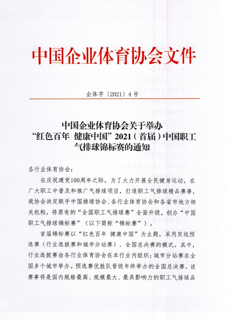 中國企業(yè)體育協(xié)會關(guān)于舉辦“紅色百年 健康中國”2021 (首屆)中國職工氣排球錦標(biāo)賽的通知