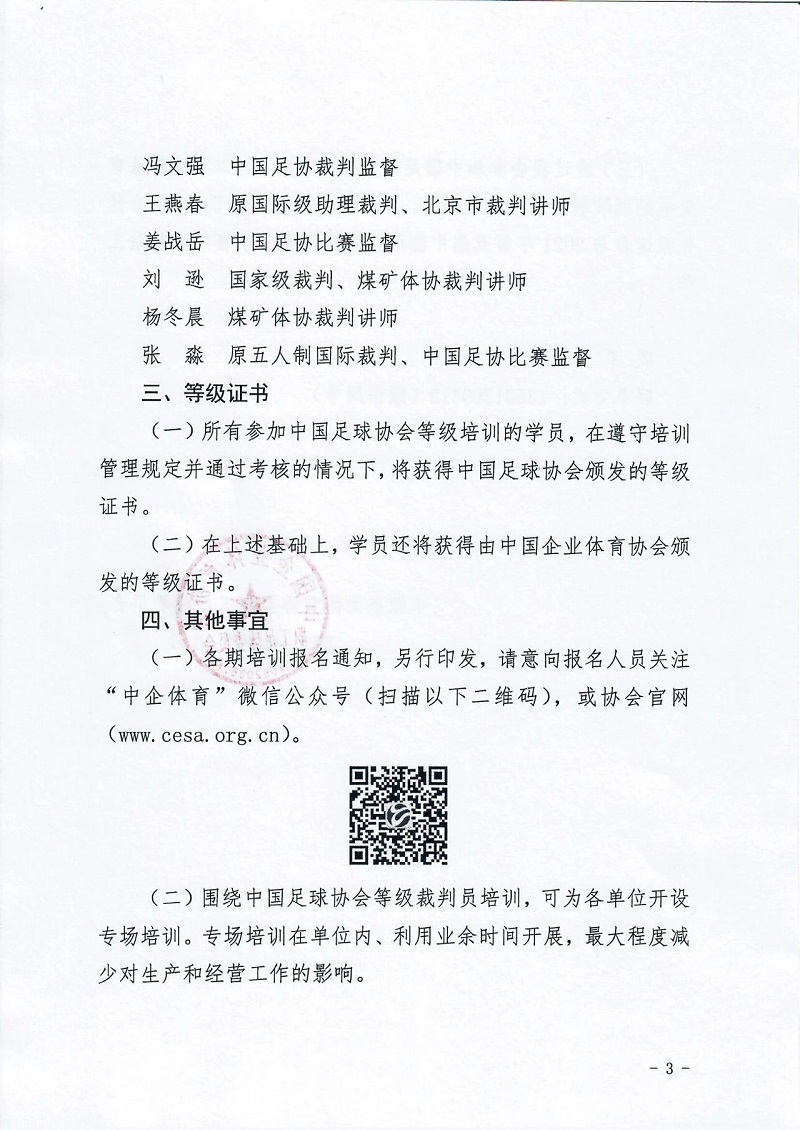 1.等級培訓。在中國足協的大力支持下,裁判部面向不同行業、不同地區機關和企事業單位的職工,開設中國足協等級裁判員培訓班。參加培訓并通過考核者,獲得由中國足協與中國企業體協分別頒發的等級裁判員證書。