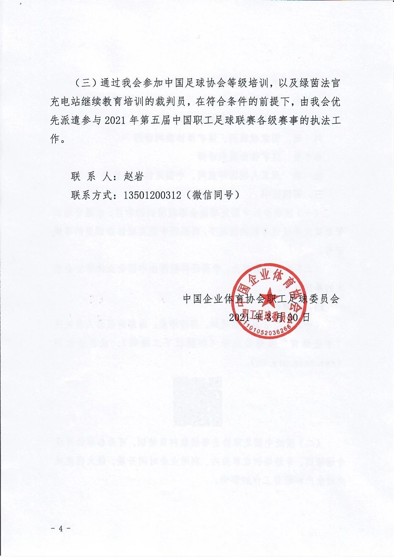 2020年,中國企業體育協會組建了職工足球委員會裁判部,一年的時間里,通過與中國煤礦體育協會聯合舉辦中國足協線上等級裁判員的培訓,培養出了一批優秀的職工裁判員,為中國職工足球聯賽充實了裁判隊伍。
