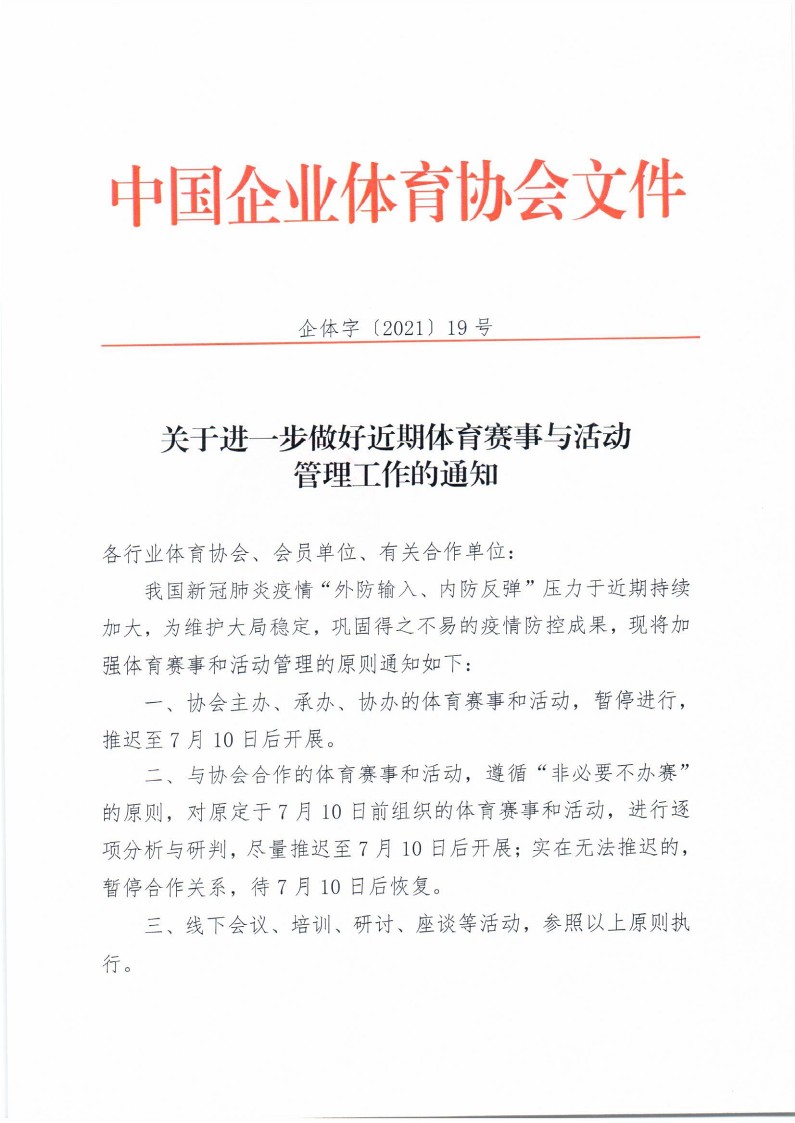 關于進一步做好近期體育賽事與活動管理工作的通知