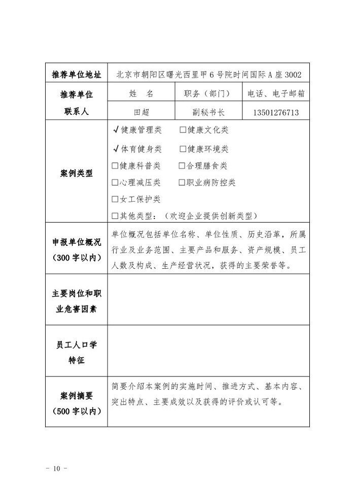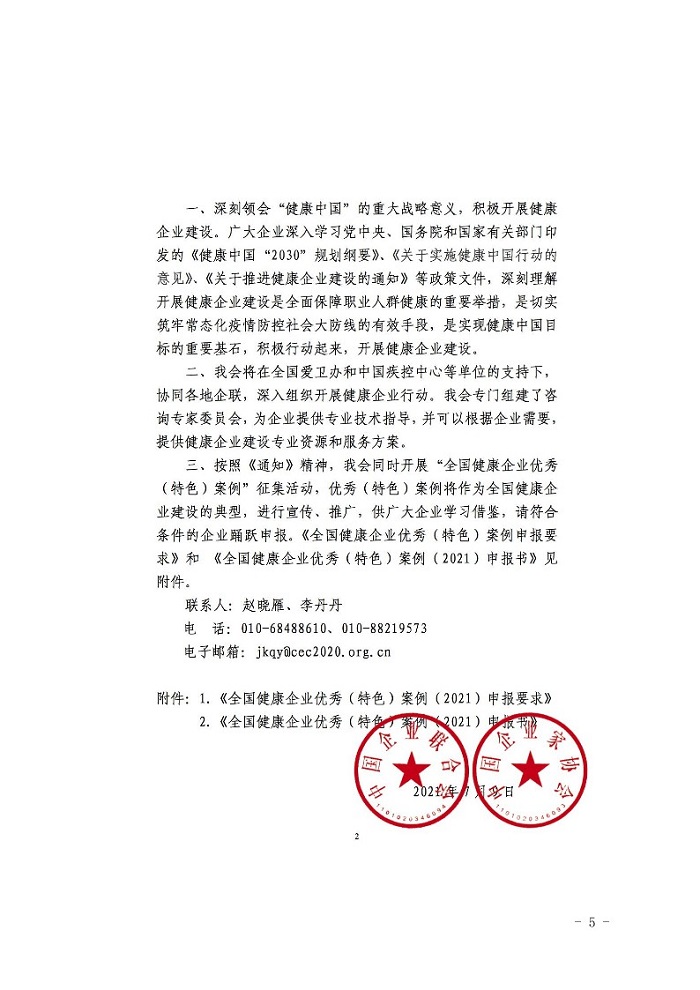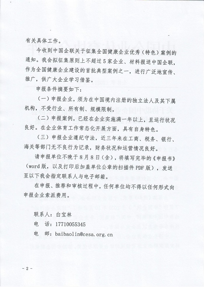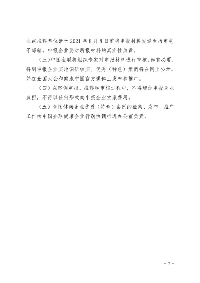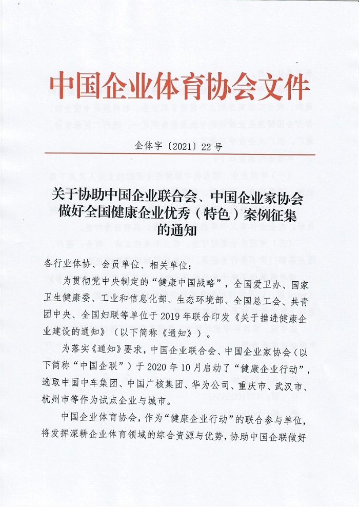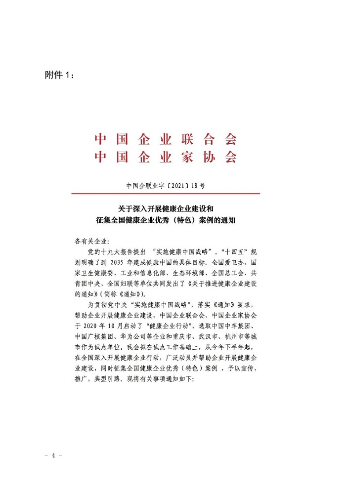 關(guān)于協(xié)助中國(guó)企業(yè)聯(lián)合會(huì)、中國(guó)企業(yè)家協(xié)會(huì)做好全國(guó)健康企業(yè)優(yōu)秀特色案例征集工作的通知