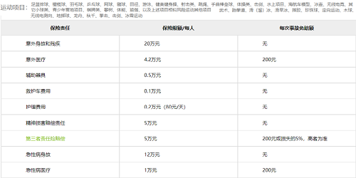 承保的運(yùn)動(dòng)項(xiàng)目?jī)H限于在體育場(chǎng)館或公園、探險(xiǎn)公園內(nèi)的運(yùn)動(dòng)或探險(xiǎn)活動(dòng)項(xiàng)目;投保人數(shù)200人起,未滿200保費(fèi)按200人計(jì)算。