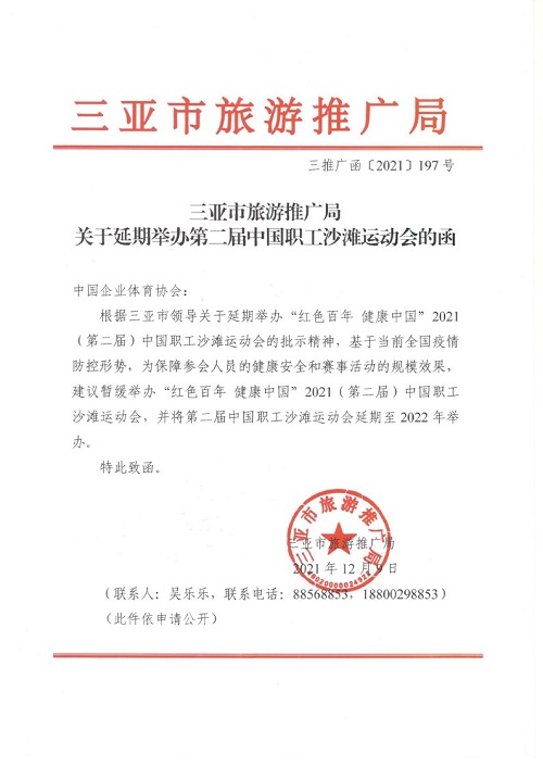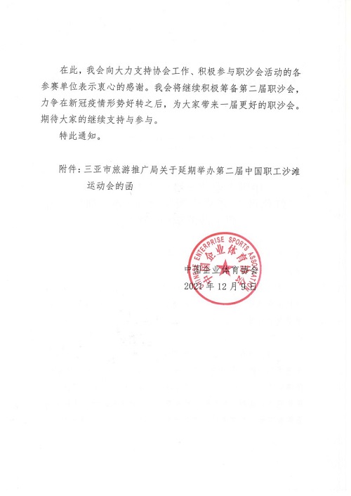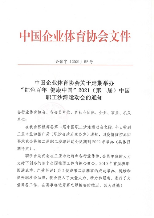 中國企業(yè)體育協(xié)會(huì)關(guān)于延期舉辦“紅色百年健康中國”2021 (第二屆)中國職工沙灘運(yùn)動(dòng)會(huì)的通知