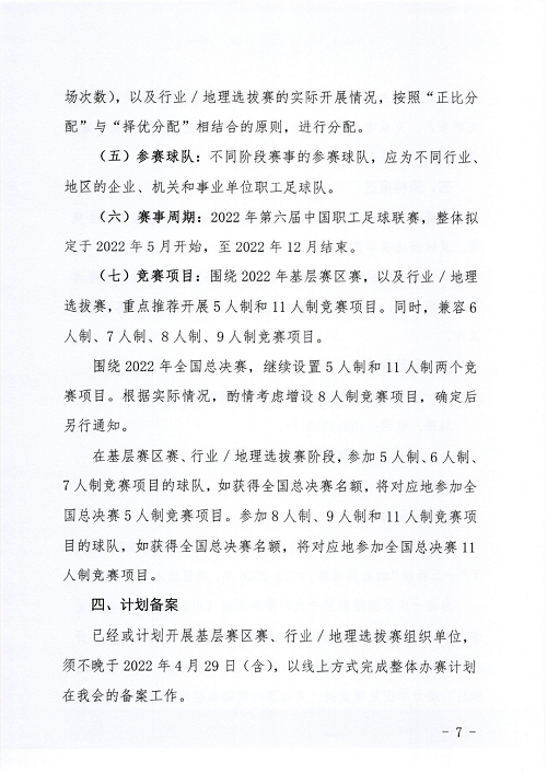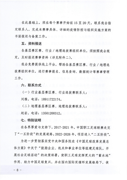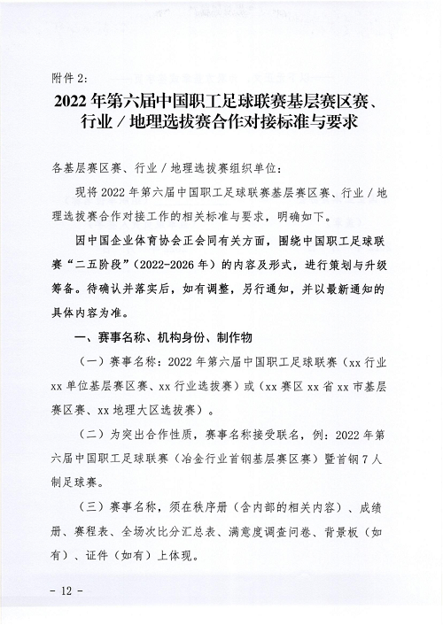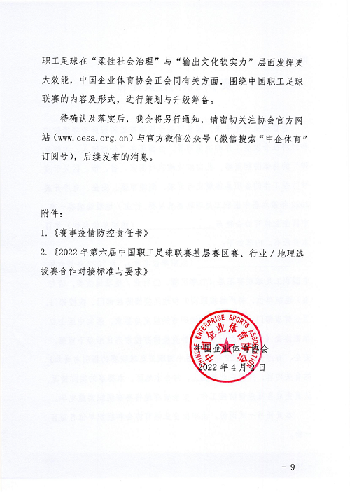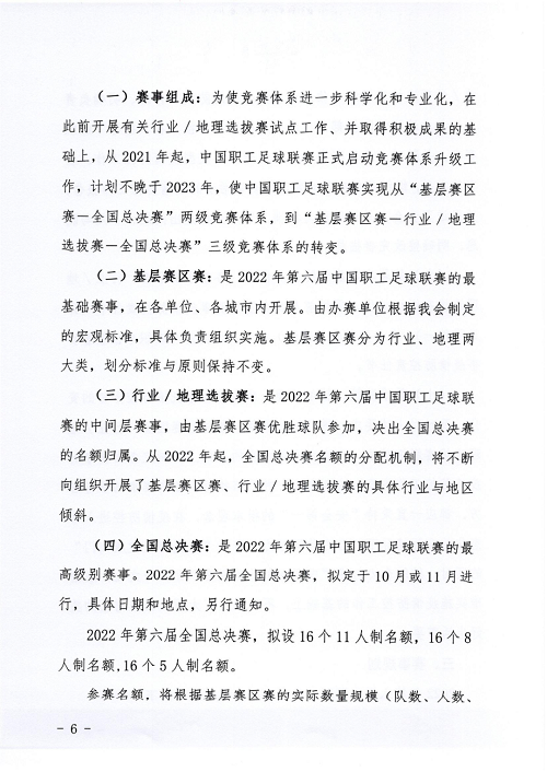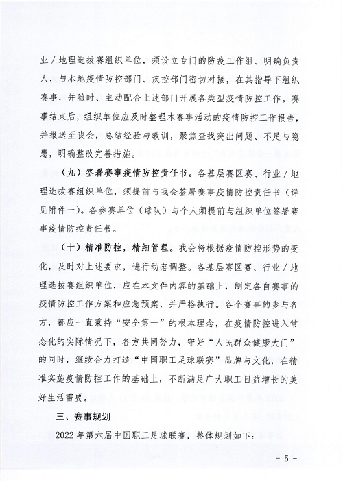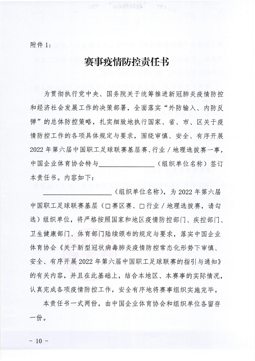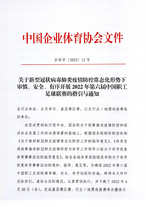 關于新型冠狀病毒肺炎疫情防控常態化形勢下審慎、安全、有序開展2022年第六屆中國職工足球聯賽的指引與通知