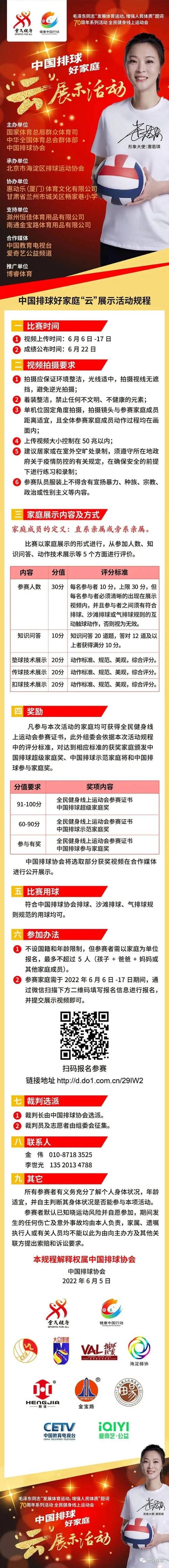 由國家體育總局群體司、中華全國體育總會群體部、中國排球協會聯合主辦的中國排球好家庭“云”展示活動在6月6日 - 17日正式啟動。