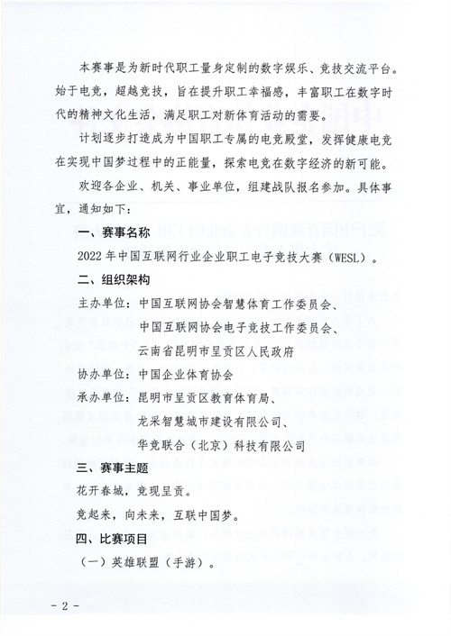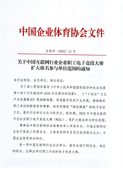 關(guān)于中國(guó)互聯(lián)網(wǎng)行業(yè)企業(yè)職工電子競(jìng)技大賽擴(kuò)大報(bào)名參與單位范圍的通知