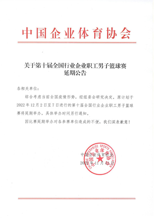 關(guān)于第十屆全國行業(yè)企業(yè)職工男子籃球賽延期公告