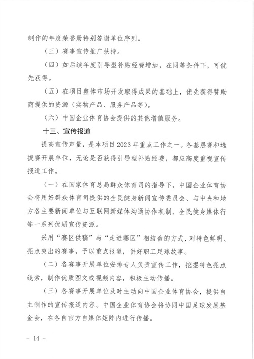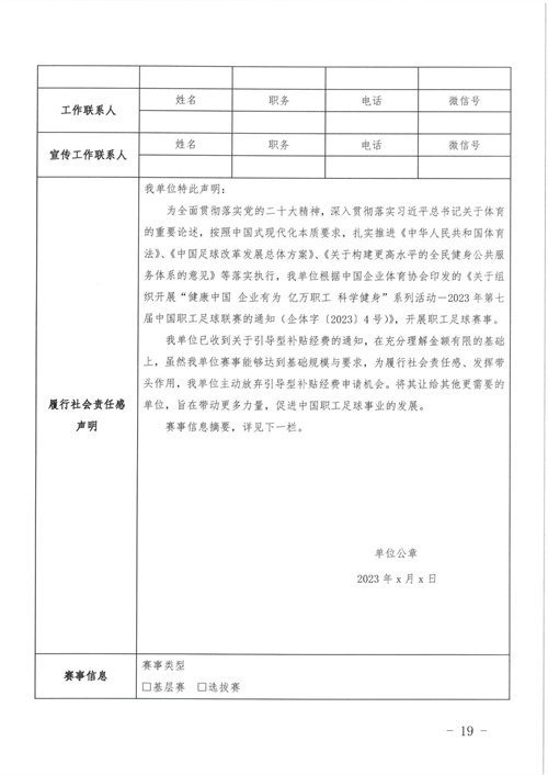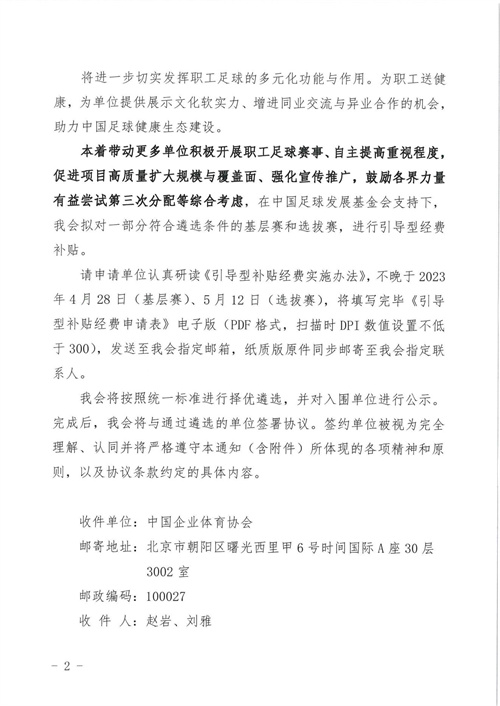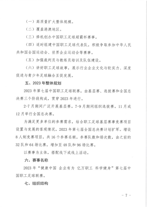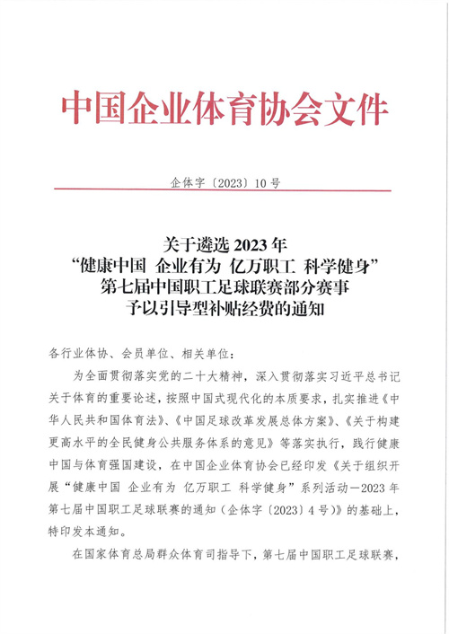 關(guān)于遴選2023年“健康中國 企業(yè)有為 億萬職工 科學(xué)健身”第七屆中國職工足球聯(lián)賽部分賽事予以引導(dǎo)型補貼經(jīng)費的通知