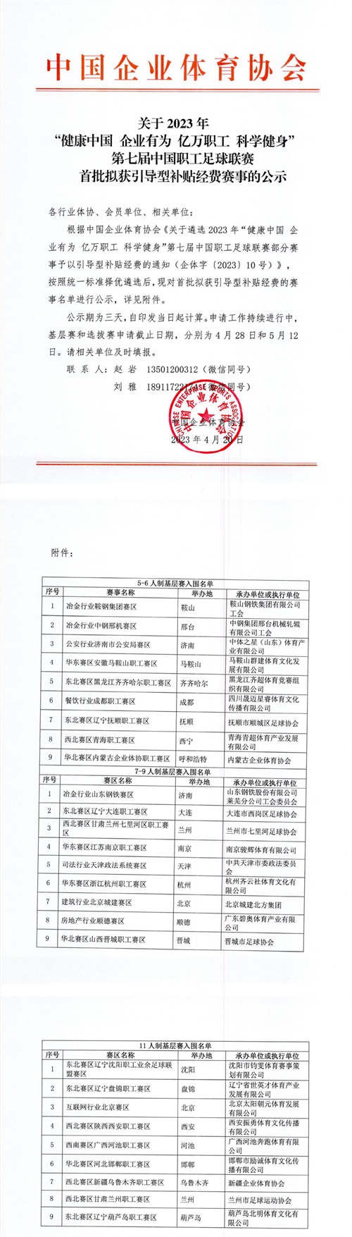 第七屆中國職工足球聯賽首批擬獲引導型補貼經費賽事的公示