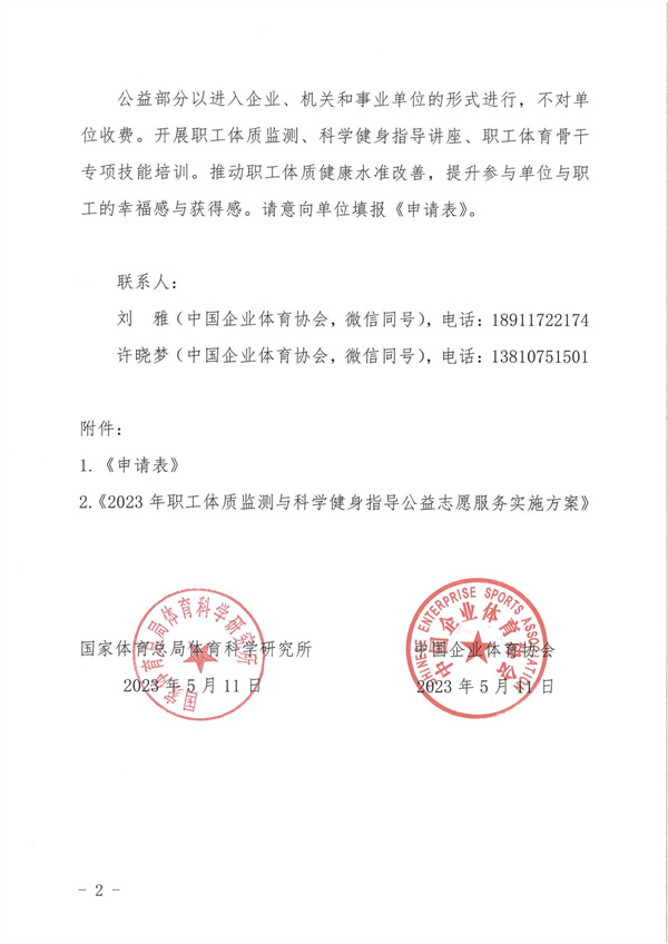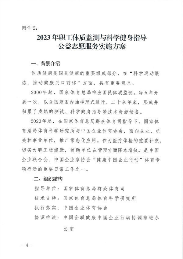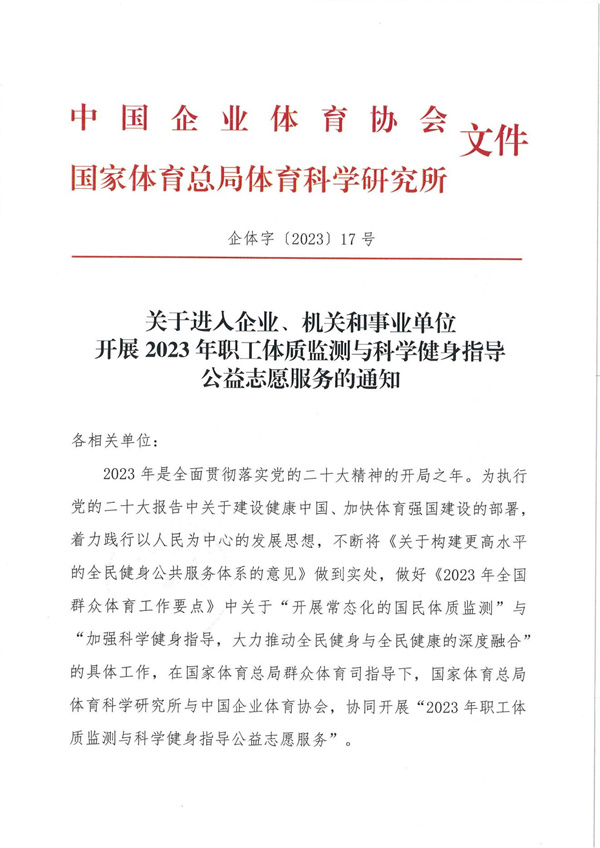 關(guān)于進(jìn)入企業(yè)、機(jī)關(guān)和事業(yè)單位開(kāi)展2023年職工體質(zhì)監(jiān)測(cè)與科學(xué)健身指導(dǎo)公益志愿服務(wù)的通知