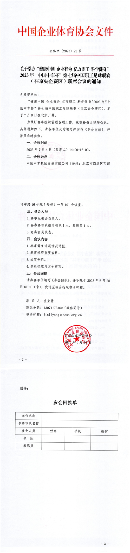 關(guān)于舉辦2023年“中國中車杯”第七屆中國職工足球聯(lián)賽(在京央企賽區(qū))聯(lián)席會議的通知