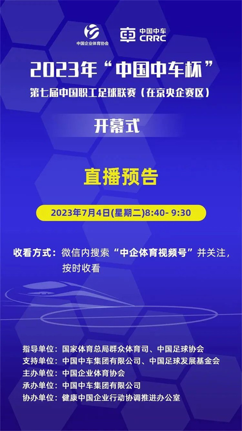 2023年“中國中車杯”第七屆中國職工足球聯賽(在京央企賽區(qū))開幕式,定于7月8日上午9點,在北京國家奧林匹克體育中心(北京朝陽區(qū)安定路1號)訓練場2號足球場進行。“中企體育視頻號”將對開幕式進行全程直播,歡迎參賽單位屆時收看。