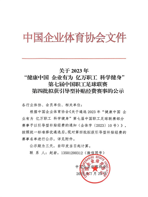 關于2023年“健康中國 企業有為 億萬職工 科學健身”第七屆中國職工足球聯賽第四批擬獲引導型補貼經費賽事的公示