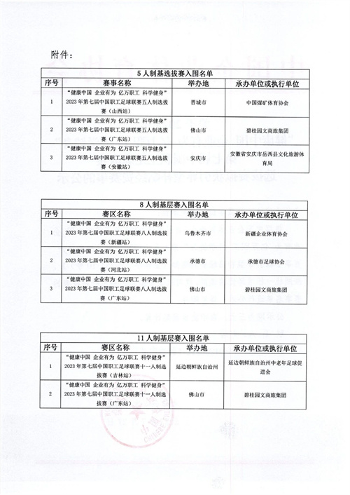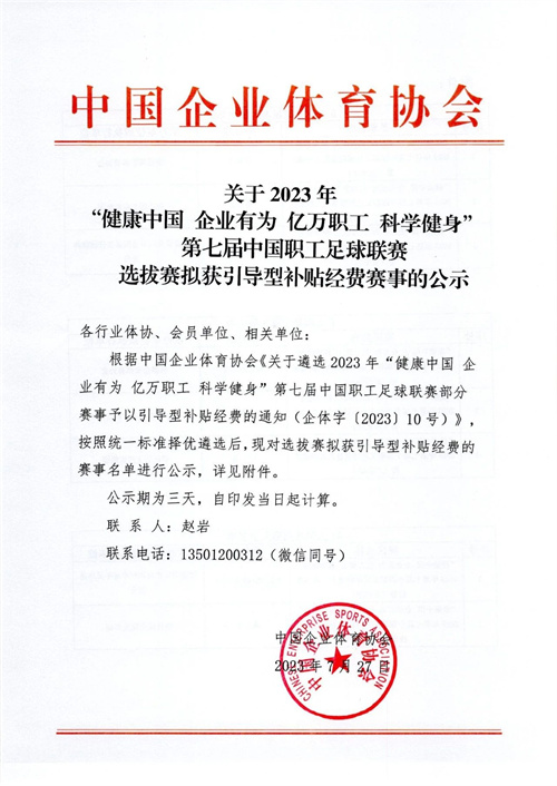 關于2023年“健康中國 企業有為 億萬職工 科學健身”第七屆中國職工足球聯賽選拔賽擬獲引導型補貼經費賽事的公示