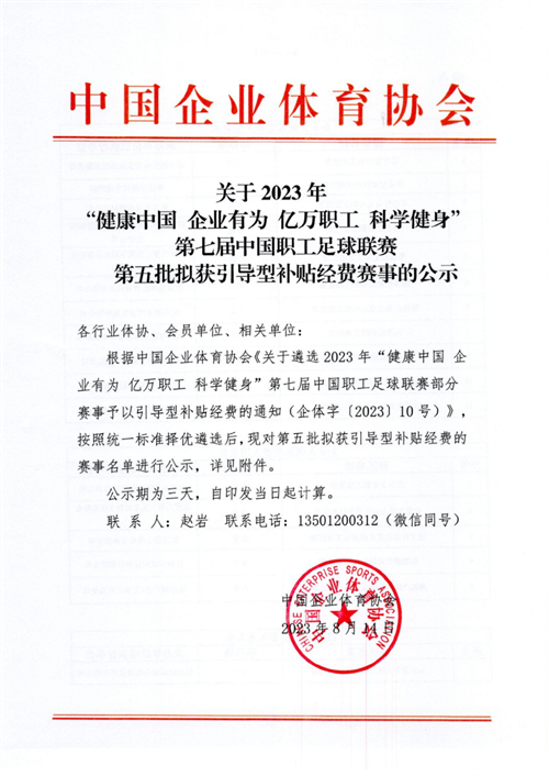 關于2023年“健康中國 企業有為 億萬職工 科學健身”第七屆中國職工足球聯賽選拔賽第五批擬獲引導型補貼經費賽事的公示