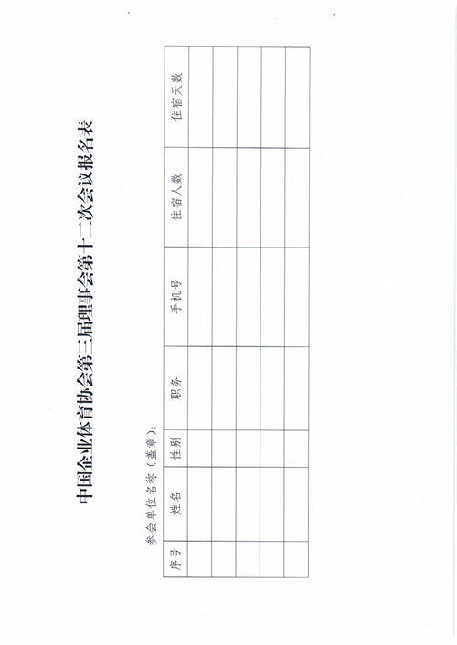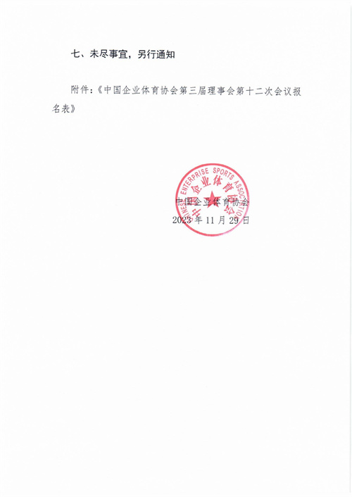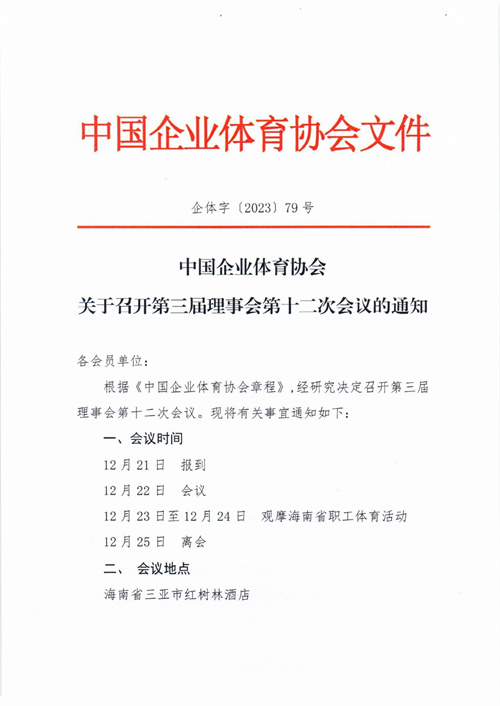 中國(guó)企業(yè)體育協(xié)會(huì)關(guān)于召開第三屆理事會(huì)第十二次會(huì)議的通知