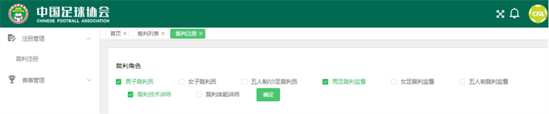 (二)如在中國足協及各會員協會擔任多重裁判角色者請在勾選裁判員角色時全部勾選本人所擔任各類裁判角色并完善相關信息,否則將無法參加未勾選的裁判角色工作。