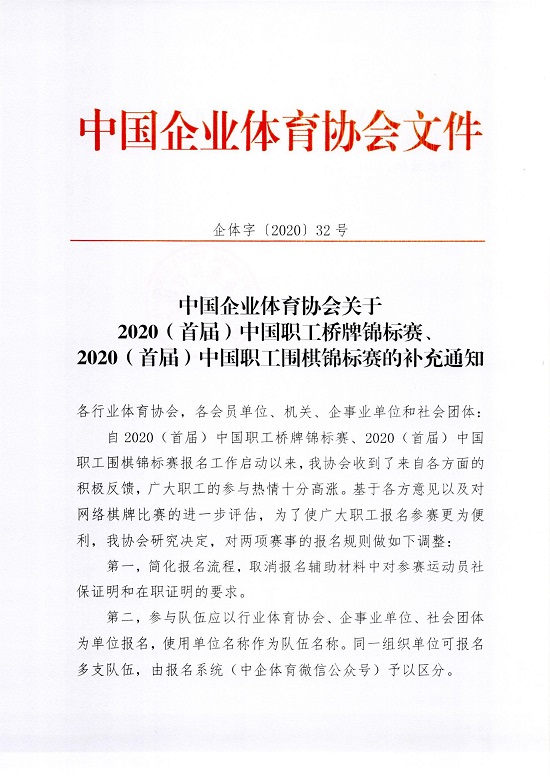 中國企業體育協會關于2020(首屆)中國職工橋牌錦標賽、2020(首屆)中國職工圍棋錦標賽的補充通知