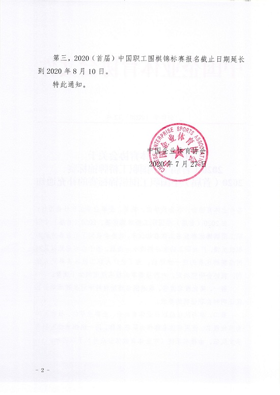 第三,2020(首屆)中國職工圍棋錦標賽報名截止日期延長到2020年8月10日。