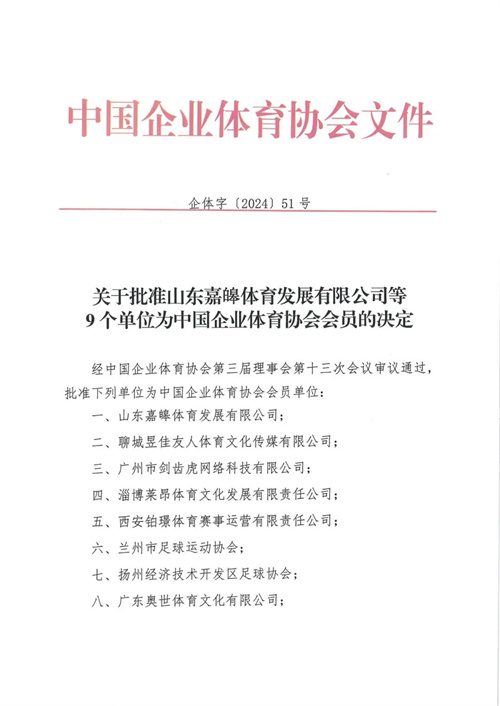 關于批準山東嘉皞體育發展有限公司等9個單位為中國企業體育協會會員的決定