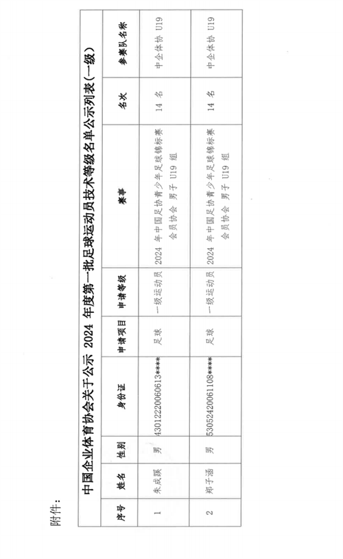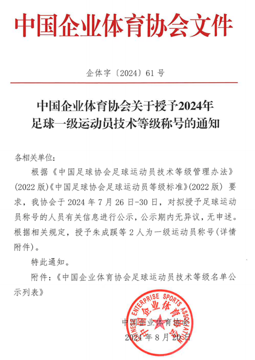 中國企業體育協會關于授予2024年足球一級運動員技術等級稱號的通知