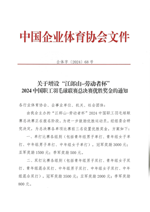 關于增設“江郎山-勞動者杯”2024中國職工羽毛球聯賽總決賽優勝獎金的通知