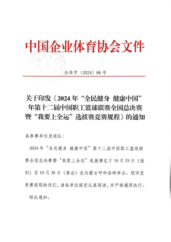 關于印發《2024年“全民健身 健康中國”第十二屆中國職工籃球聯賽全國總決賽暨“我要上全運”選拔賽競賽規程》的通知