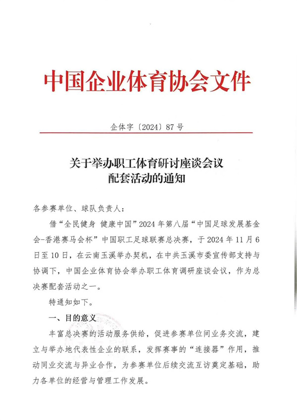 “全民健身 健康中國”2024年第八屆“中國足球發(fā)展基金會-香港賽馬會杯”中國職工足球聯(lián)賽全國總決賽(以下簡稱“總決賽”),將于11月7日在云南玉溪隆重開幕。職工體育研討座談會作為本屆總決賽配套活動之一,將于11月8日上午舉行,現(xiàn)通知如下: