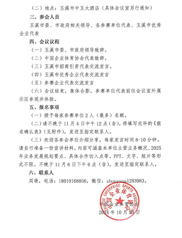 “全民健身 健康中國”2024年第八屆“中國足球發展基金會-香港賽馬會杯”中國職工足球聯賽全國總決賽(以下簡稱“總決賽”),將于11月7日上午在云南玉溪隆重開幕。圍繞總決賽展開營商交流,是本屆總決賽重要配套活動之一,營商交流會議將于11月9日上午在玉溪市中玉大酒店舉行,現通知如下: