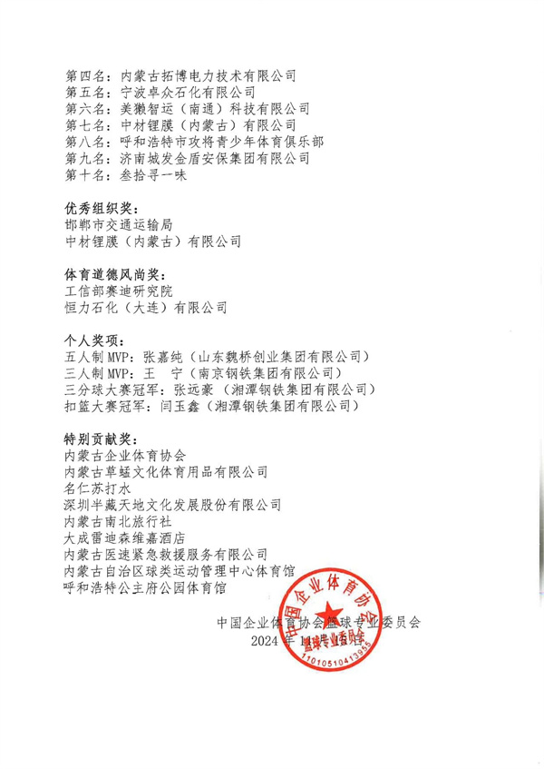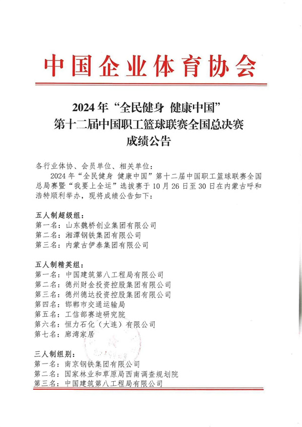 2024年“全民健身 健康中國”第十二屆中國職工籃球聯賽全國總決賽成績公告