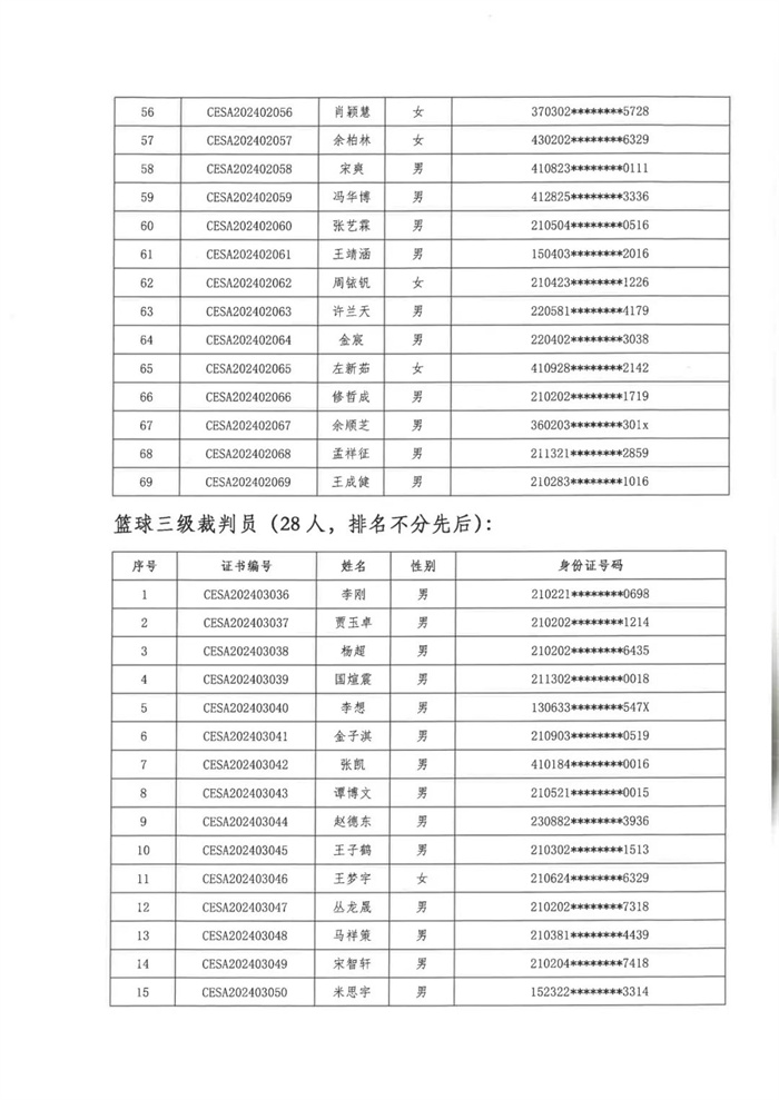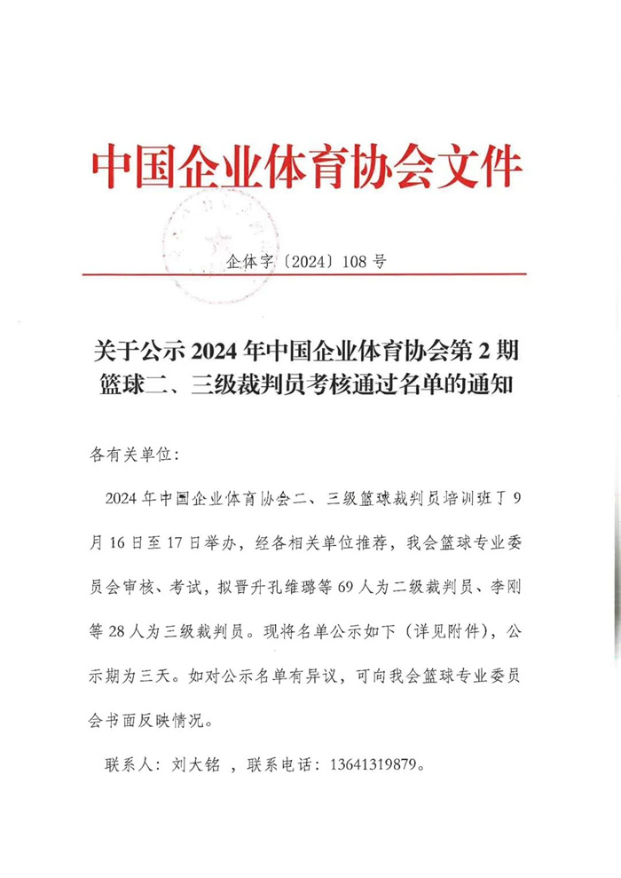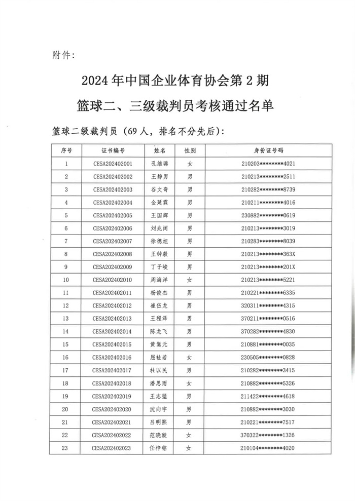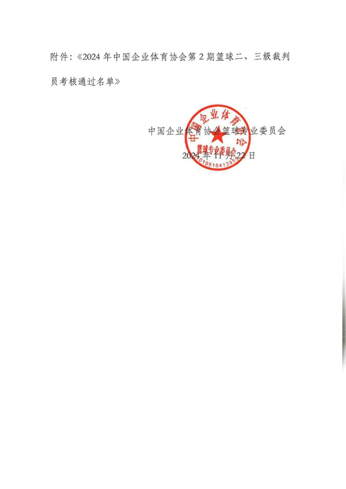 關于公示2024年中國企業體育協會第2期籃球二、三級裁判員考核通過名單的通知