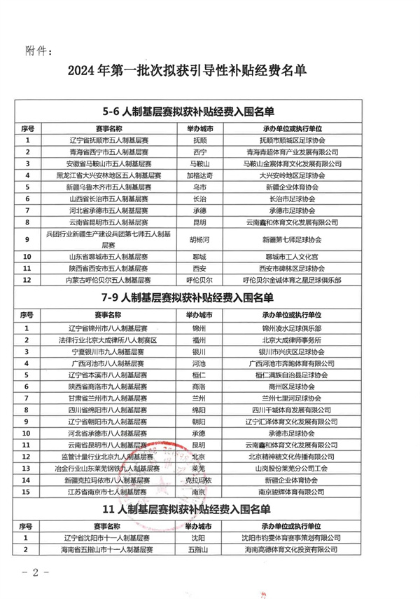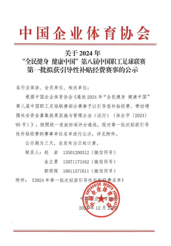 關于2024年“全民健身 健康中國”第八屆中國職工足球聯賽第一批擬獲引導性補貼經費賽事的公示