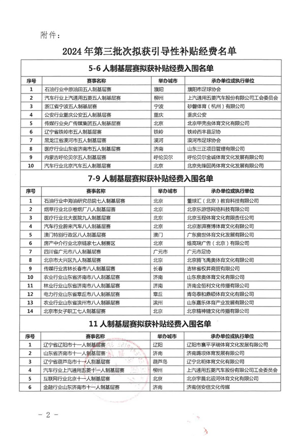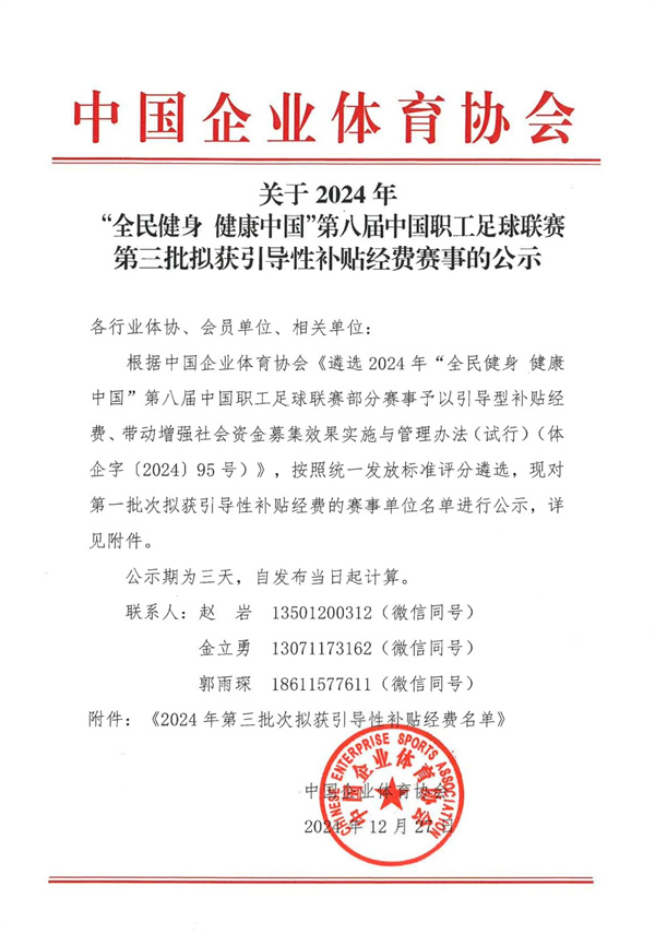 關于2024年“全民健身 健康中國”第八屆中國職工足球聯賽第三批擬獲引導性補貼經費賽事的公示