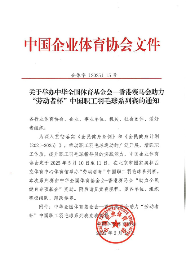 關于舉辦中華全國體育基金會-香港賽馬會助力“勞動者杯”中國職工羽毛球系列賽的通知