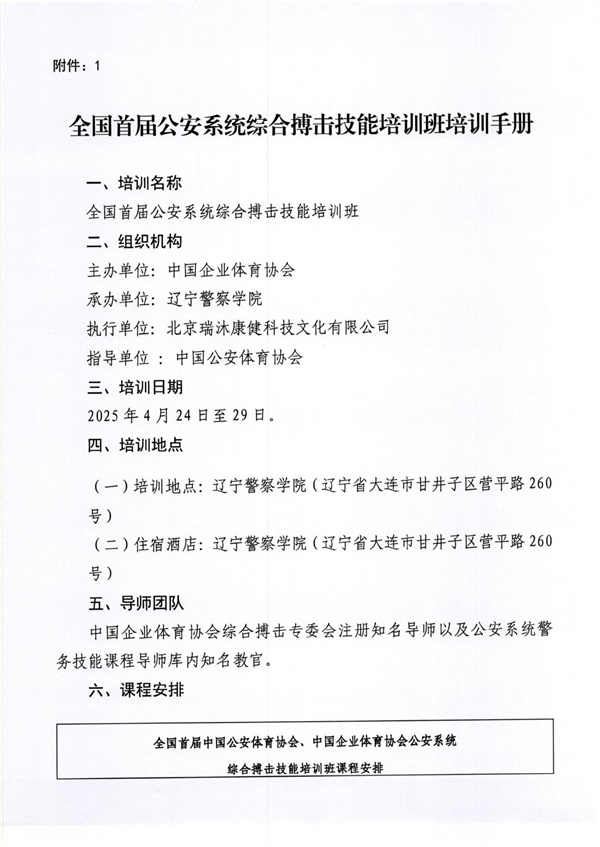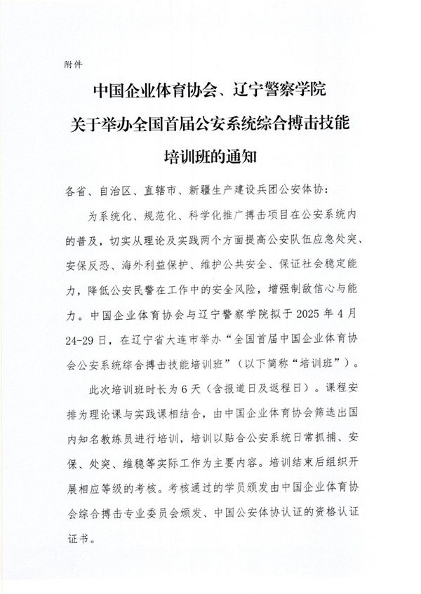 1、中國企業(yè)體育協(xié)會、遼寧警察學(xué)院關(guān)于舉辦全國首屆公安系統(tǒng)綜合搏擊技能培訓(xùn)班的通知