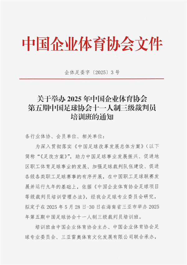 關于舉辦2025年中國企業體育協會第五期中國足球協會十一人制三級裁判員培訓班的通知