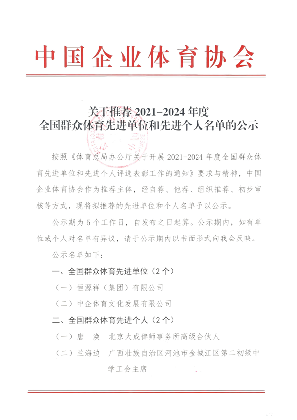 關于推薦2021-2024年度全國群眾體育先進單位和先進個人名單的公示