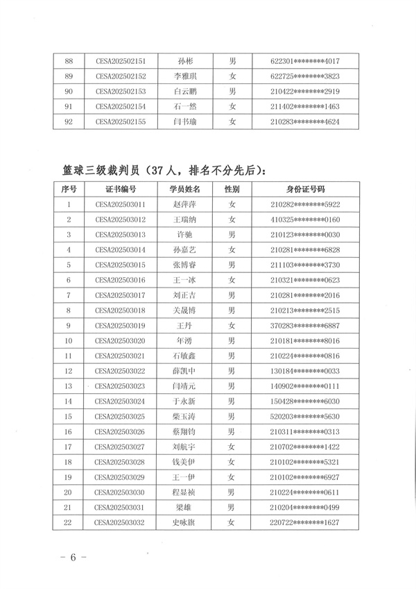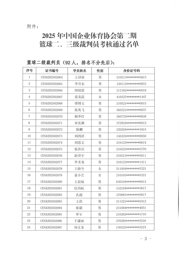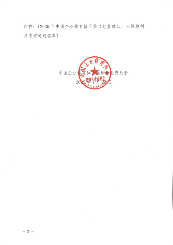 關于公示2025年中國企業體育協會第二期籃球二、三級裁判員考核通過名單的通知