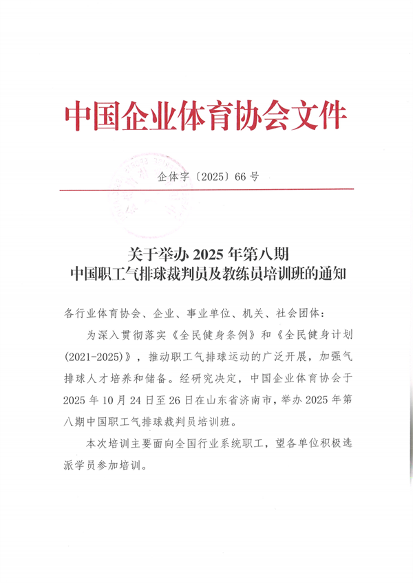 關(guān)于舉辦2025年第八期中國(guó)職工氣排球裁判員及教練員培訓(xùn)班的通知