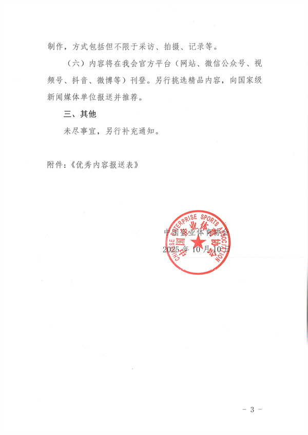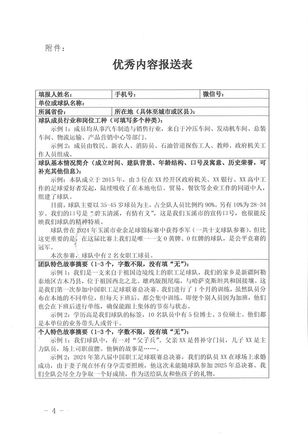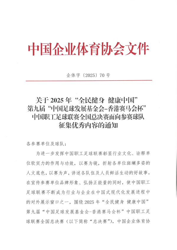 1、關于2025年“全民健身 健康中國”第九屆“中國足球發展基金會-香港賽馬會杯”中國職工足球聯賽全國總決賽面向參賽球隊征集優秀內容的通知