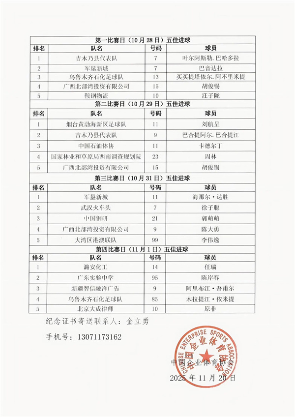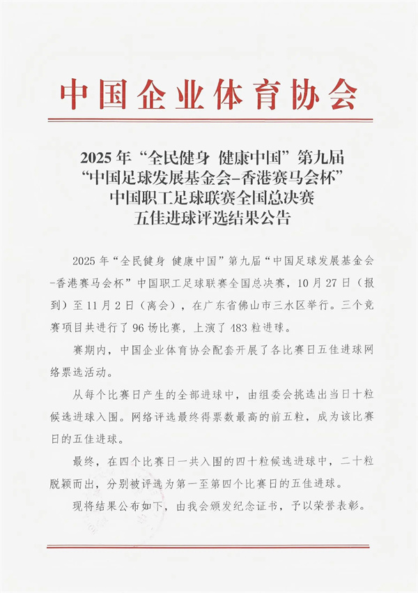 2025年“全民健身健康中國”第九屆“中國足球發展基金會-香港賽馬會杯”中國職工足球聯賽全國總決賽五佳進球評選結果公告