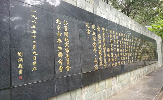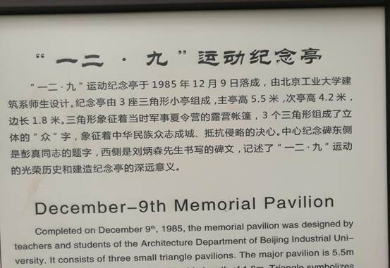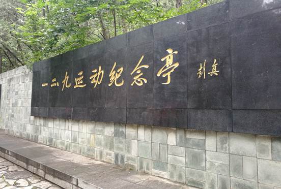 1984年,北京團市委響應團中央學史建碑的號召,決定在櫻桃溝建立一二?九紀念亭,并于1984年10月8日在此舉行奠基儀式,時任中央書記處書記的鄧立群等領導和團市委、市學聯及大學生代表參加了儀式。我時任市學聯常務副主席,參與了全部的籌備工作。1985年12月正式落成,是彭真同志題詞,劉炳森書法家書寫的碑文。紀念亭由三座三角形小亭組成,又組成眾字,象征中華民族眾志成城抗日的決心!當時,北京的大、中學都為建紀念亭捐款。如今,一二?九紀念亭已成為北京市愛國主義教育基址。