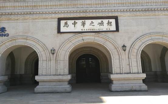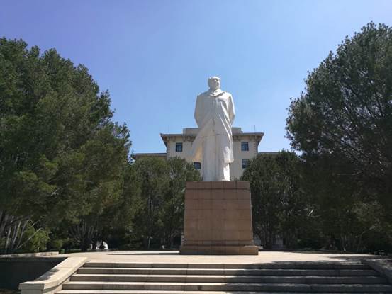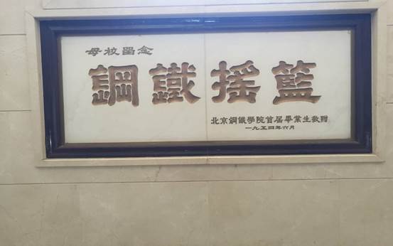 因是暑假,校園里空蕩蕩的,連平時最熱鬧的田徑場都沒有人。我從南門入校,習慣性的騎到西門,從這里開始先看到的是山東校友捐贈的泰山石《北京科技大學》校名,接著就是毛澤東主席全身塑像,據說在80年代曾折除了不少主席塑像,但當時鋼院師生強烈要求保留這尊主席塑像,成為京城為數不多的保留毛澤東主席塑像的單位之一。當然,我每次從西門進入的主要目的是為了參觀主席塑像后面的《為中華之崛起》漢白玉匾,這是76級一千多名校友捐贈給母校的珍貴禮物!當時共收到捐款一千多元,用于購買漢白玉原料、請建筑雕塑廠刻匾、給捐款者每人三張電影票(露天電影,5分一張票)、一張六吋的黑白照片等,在捐匾揭幕儀式當天還放了200多元的鞭炮……當時的一千多元人民幣多么值錢,辦了這么多事兒!當然我每次都會從主樓繞到東側進入主樓二樓拍下《鋼鐵搖籃》,這是鋼院首屆畢業生獻給母校的禮物。