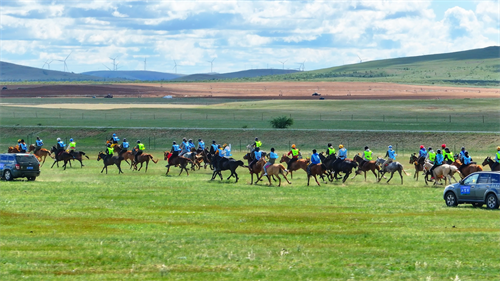 在初夏喜雨后生機盎然的金蓮川草原上,來自東烏旗、西烏旗、克什克騰旗、正藍旗等地的農牧民選手人人身著節日盛裝,帶著自家精心調馴、仔細裝扮、精神抖擻的蒙古馬展開激烈角逐。本次賽事共設置三大比賽項目:蒙古馬20公里耐力賽、三人三馬團體接力賽、5公里走馬比賽。