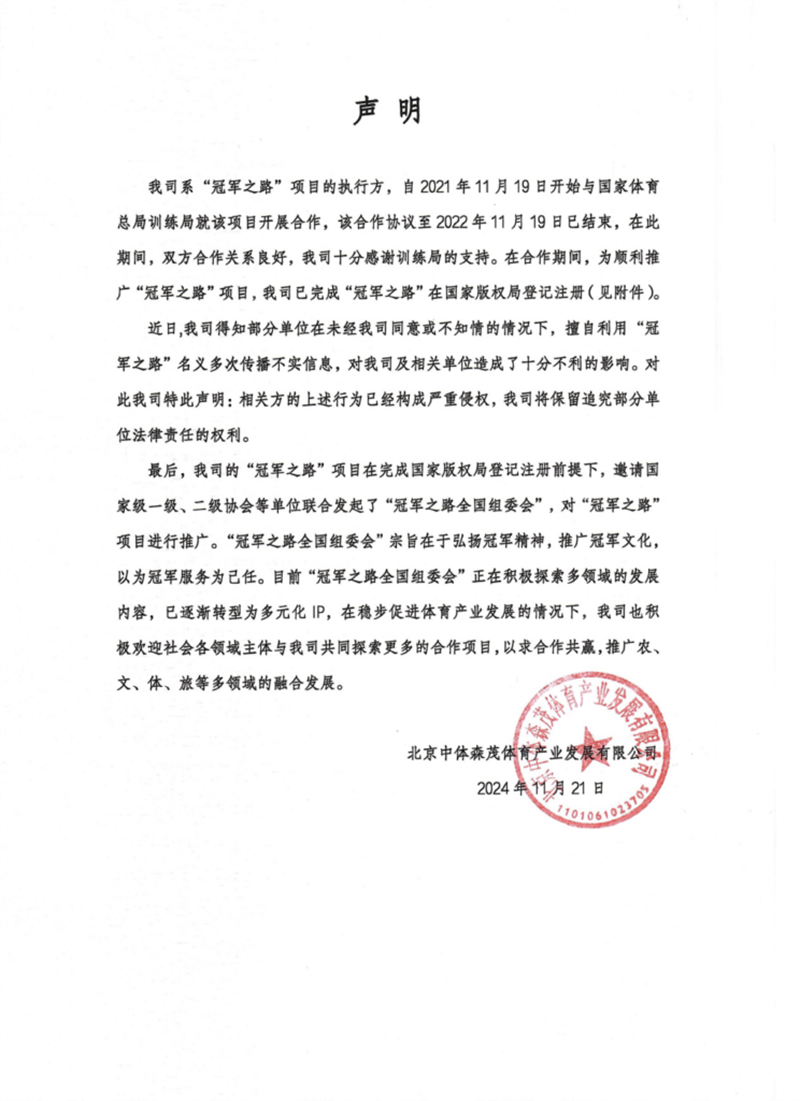 關于“冠軍之路”項目的聲明