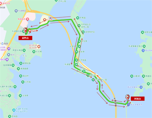 【起點】湖光序曲→九女墩→曲堤凌波→湖心歸沐→楚云橋→鵝詠陽春【折返點】→楚云橋→湖心歸沐→曲堤凌波→九女墩→湖光序曲【終點】