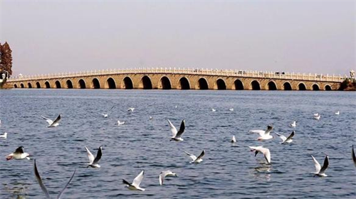 1996年,曲堤東段建成一座23孔的“雁歸橋”,成為全國孔數最多的風景橋,遠遠望去,既有中國傳統建筑風格之美,又富有強烈的節奏感和韻律感。其位于東湖沿湖綠道由梨園通往磨山的中段,該橋連接了郭鄭湖與團湖,使湖泊相接,魚蝦可以互訪,小船可以穿梭,十里長堤頓時“活”起來了。登磨山楚天臺眺望曲堤,宛若一條巨龍遨游在浩瀚的湖面上,十分壯觀。