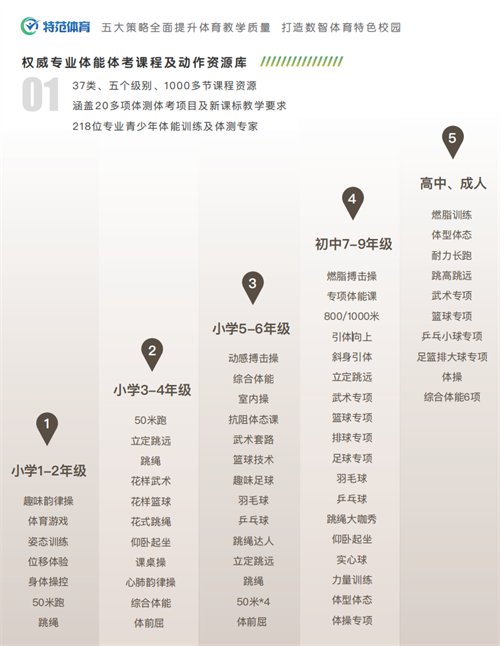 【特范體育】可提供上千節(jié)體育課程,內(nèi)容包含體考20余項(xiàng)內(nèi)容,搏擊操、韻律操、課桌操、籃球、小器械循環(huán)等主題。智能臂帶采集運(yùn)動(dòng)數(shù)據(jù),保證安全運(yùn)動(dòng)的同時(shí),提供科學(xué)數(shù)據(jù)報(bào)告。