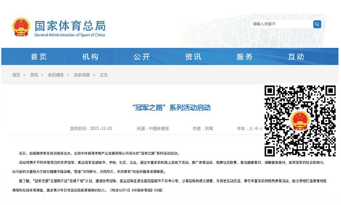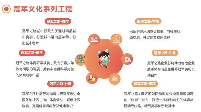 “冠軍之路”系列活動是為了響應習近平總書記提出的體育強國、全民健身號召的背景下,由國家體育總局訓練局與北京中體森茂體育產業發展有限公司聯合發起,中體森茂獨家運營的國家級IP項目。分享冠軍們勵志奮斗的經歷和金牌背后的故事,開展運動技能傳授和健身互動等系列活動,傳播“自信、自強、自尊”體育正能量, 激發并引導廣大青少年和群眾參加體育運動的熱情。