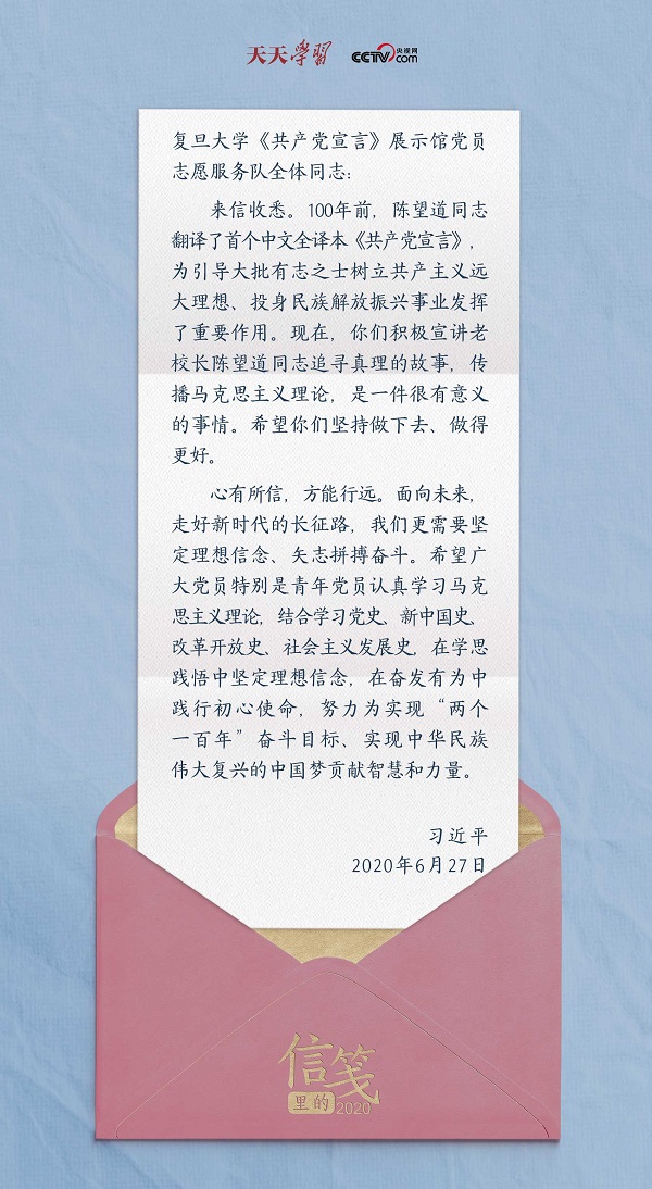 今年夏天,黨員志愿服務(wù)隊的30名隊員給習(xí)近平總書記寫了封信,匯報了參加志愿講解服務(wù)的經(jīng)歷和體會,并表達(dá)了做《共產(chǎn)黨宣言》精神忠實傳人的信心和決心。